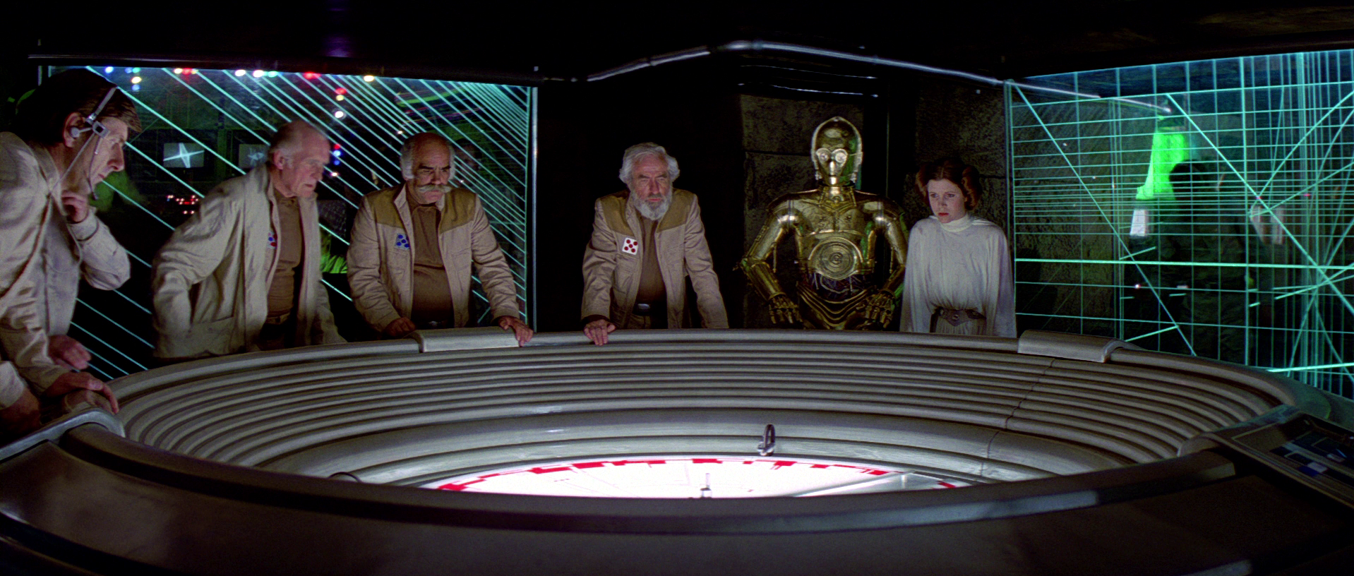 Rebel fighters flying in formation settle ominously in the foreground and very slowly pull away.